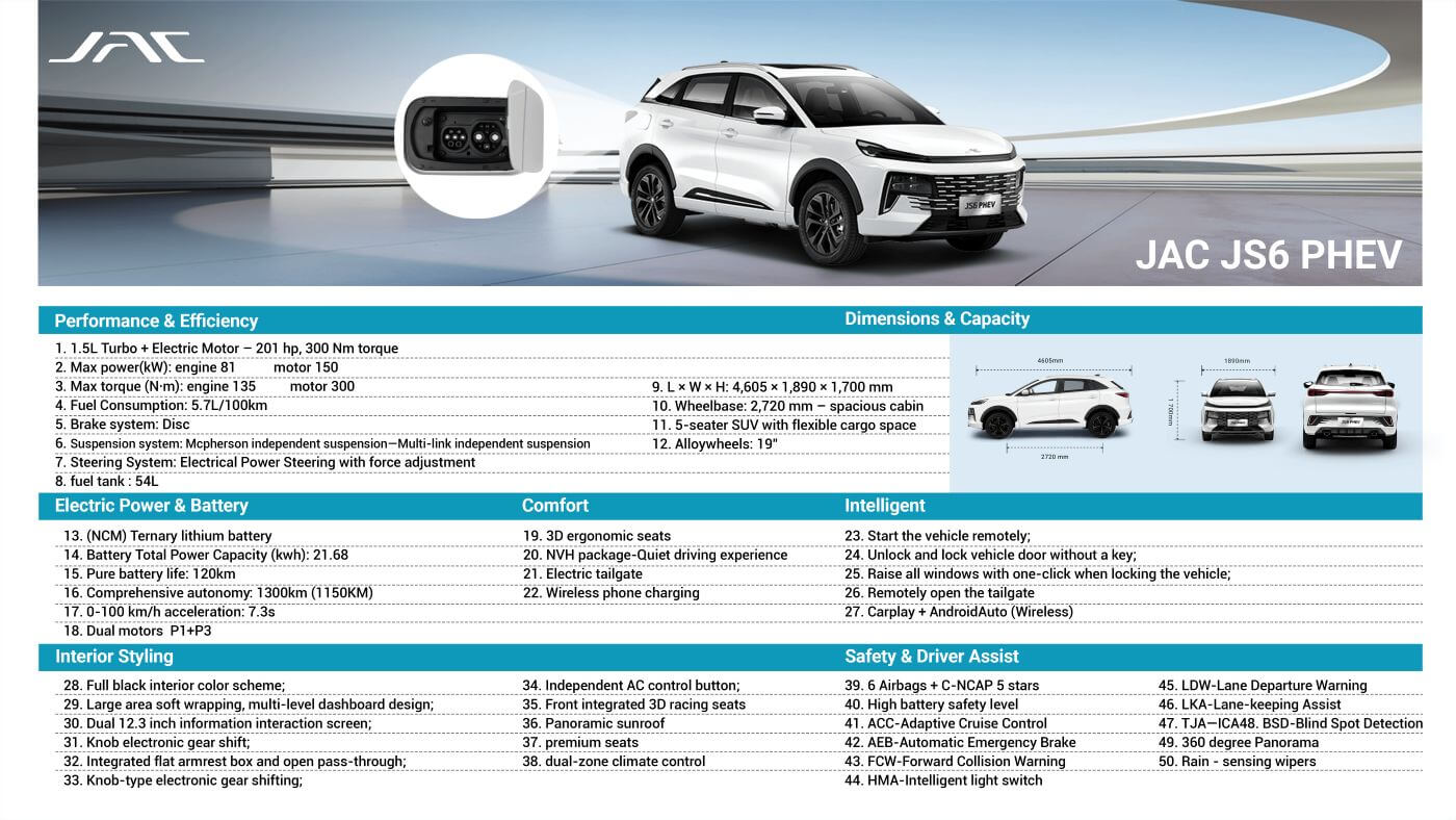 No more autonomy anxiety. Combining style, performance, and environmental friendliness, the JS6 PHEV is the ideal choice for hybrid SUV, whether you're on a short journey or a road trip.