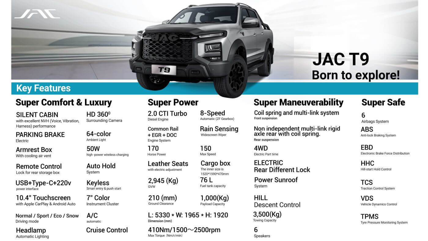 JAC T9 pickup, combines remarkable rugged capability with premium comfort and advanced technology to fuel your wildest adventures.